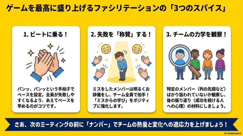 - あえてペースを早める: 全員が失敗しやすくなるよう、番号が頻繁に変わるタイミングでペースを上げ、変化へのプレッシャーを与えます。