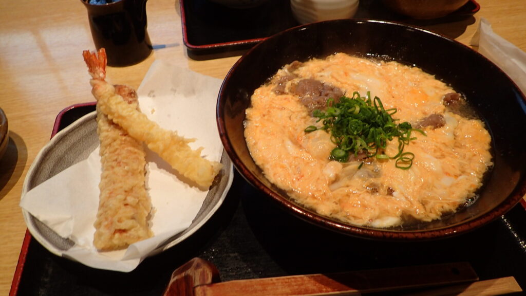今回いただいた一杯「黒毛和牛肉とじうどん + ちくわ・海老天(別盛)」