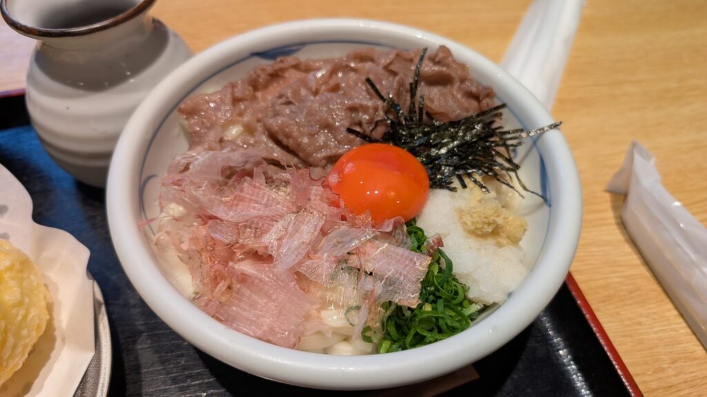 運ばれてきた丼から立ち上るのは、鰹と昆布の香り。そこにふんわりと溶き卵が重なり、中央には存在感十分の黒毛和牛。ひと口すすれば、まず感じるのは出汁の丸み。ぶっかけよりも温度と水分量がある分、牛肉の旨みと卵のまろやかさが自然に溶け合っている。黒毛和牛は甘辛すぎず、脂も過度に主張しない。
