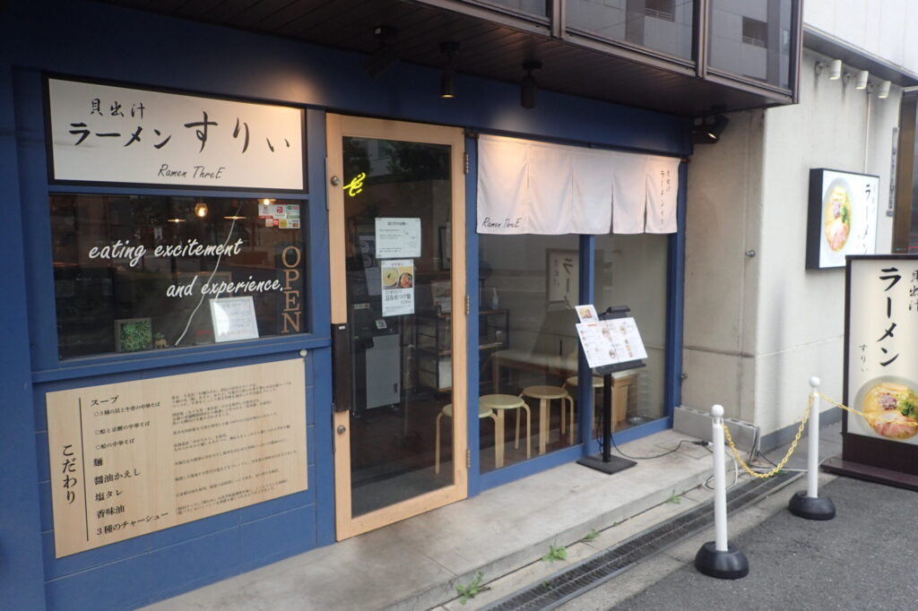 大阪・肥後橋。オフィス街として知られるこのエリアに、ラーメン好きの間で静かに、しかし確実に評価を高めている一軒がある。その名も 「Ramen ThreE(ラーメン すりぃ)」。東京・下北沢の名店「貝麺みかわ」の系譜を汲み、貝出汁を主役に据えた中華そばで勝負する専門店だ。