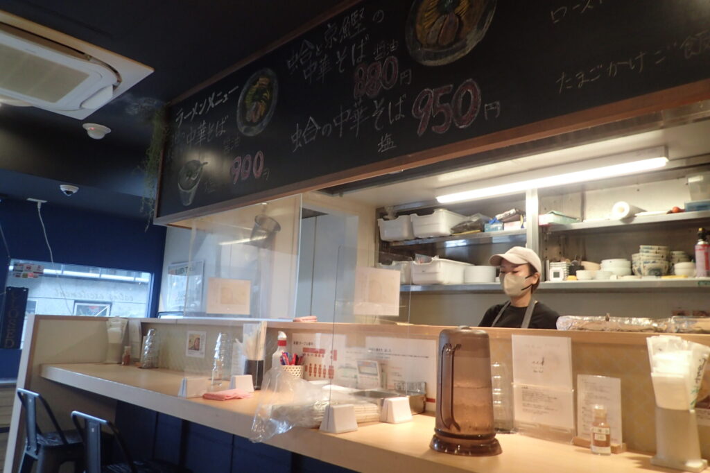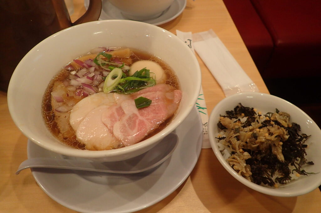 場所は大阪メトロ四つ橋線・肥後橋駅から徒歩すぐ。ガラス張りのファサードに白木を基調とした内装は、一般的な“ラーメン屋”のイメージよりも、どこか和食割烹に近い落ち着きがある。店内にはカウンター席とテーブル席。ランチタイムはビジネスパーソンで賑わうが、回転は良く、貝出汁の香りが漂う空間に身を置くだけでも期待値は自然と高まる。