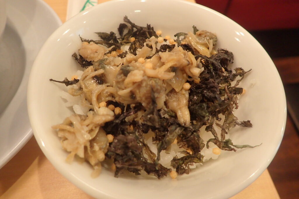 ご飯の上には、刻み貝・あられ・磯のり。まずはそのまま、次にラーメンの残りスープをかけて…これがもう、反則級の旨さ。貝出汁が白米に染み込み、雑炊とも茶漬けとも違う、ここでしか味わえない“〆”に昇華する。