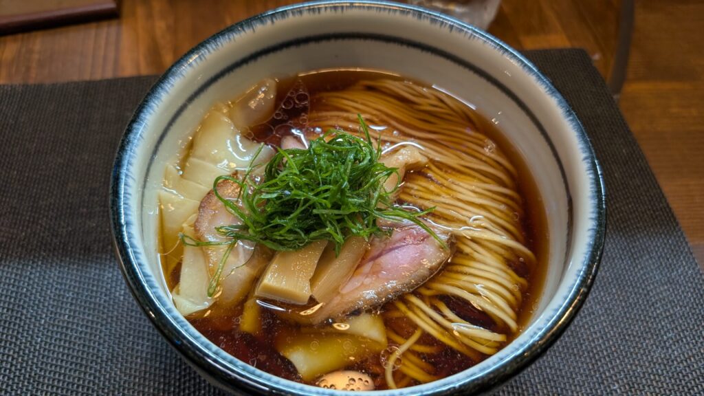 麺は京都「棣鄂」製の中細ストレート麺。すすった瞬間に香る小麦の風味、ほどよいコシ、そしてスープをしっかり持ち上げる麺肌の美しさが特徴だ。レビューでも「麺線が美しい」「喉越しが良い」と高く評価されており、同店がいかに素材選びと調理にこだわっているかを物語っている。