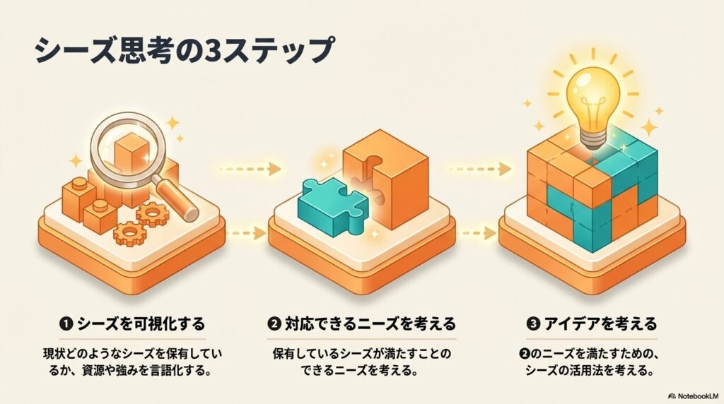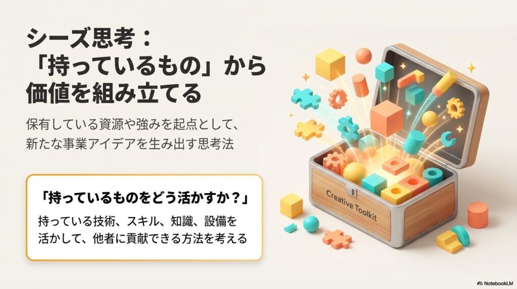 シーズ思考とは、自分が保有している資源(シーズ)や強みを起点として、どのような価値を生み出せるかを考える思考法です。
