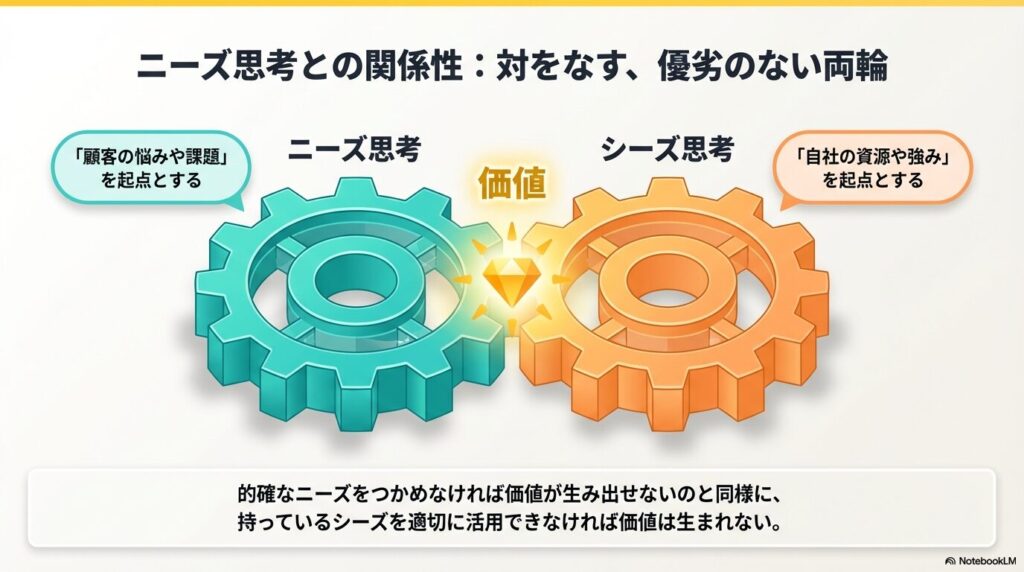 顧客の悩みや課題から出発する「ニーズ思考」と対をなす考え方であり、「持っているものをどう活かすか?」という問いを持つことがポイントです。どちらが優れているということはなく、シーズ起点とニーズ起点の考え方を行き来できるようになることが、価値創造において大切です。