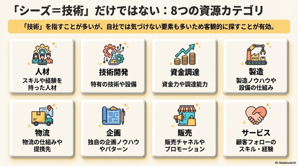 まずは、現状どのようなシーズを持っているのかを言語化します。 シーズ=技術と思われがちですが、以下のように幅広い視点で自社の資源を見直してみましょう。