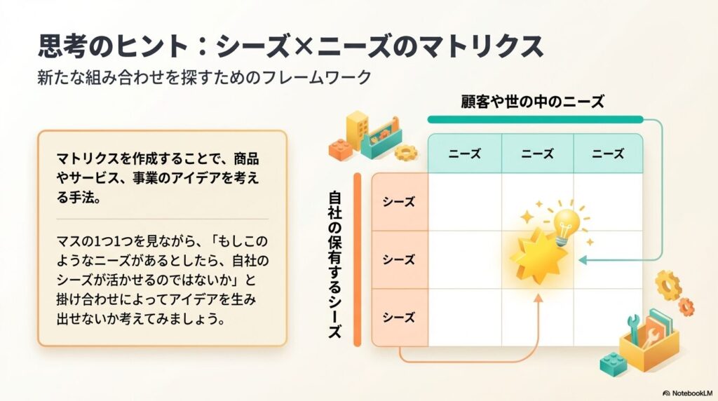 新しいアイデアを見つけるコツとして、「シーズとニーズののマトリクス(表)」を作成する手法があります。 縦軸に自社のシーズ、横軸に世の中のニーズを並べ、それらがクロスする部分で何ができるかを1つずつ検討することで、思いもよらない新事業や商品のアイデアが生まれることがあります。