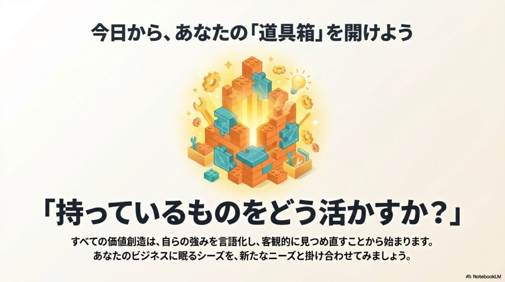 「自分たちには何ができるだろう?」と一度立ち止まり、**足元にある宝物(シーズ)**を数え上げることから始めてみませんか?ニーズ思考と組み合わせることで、より確固たるビジネスの柱が見つかるはずです。