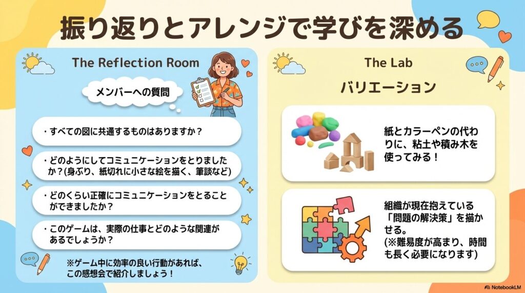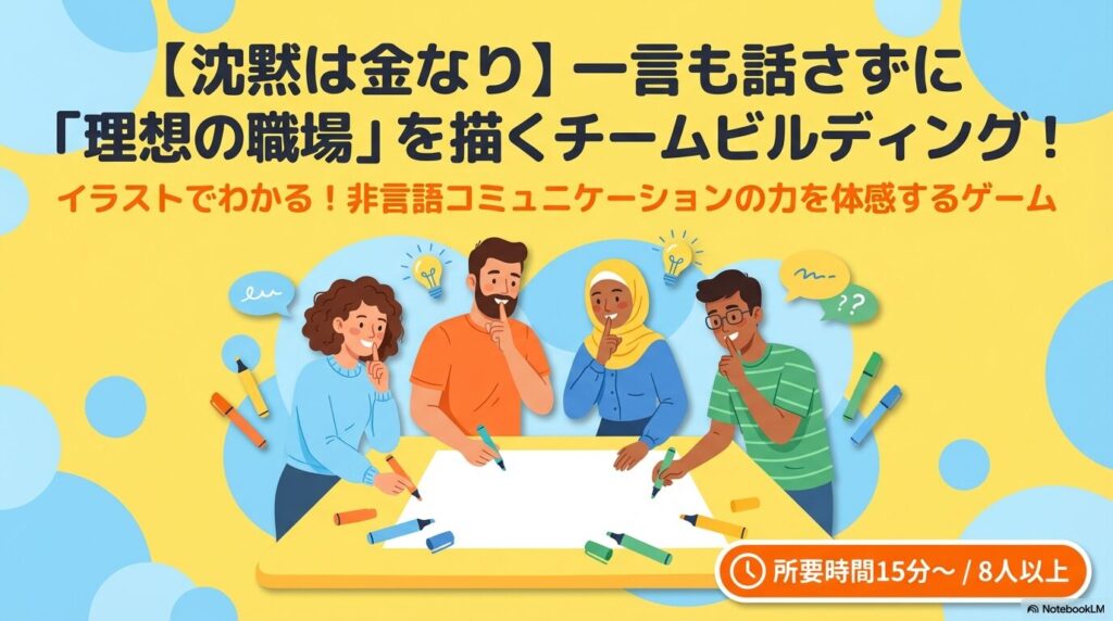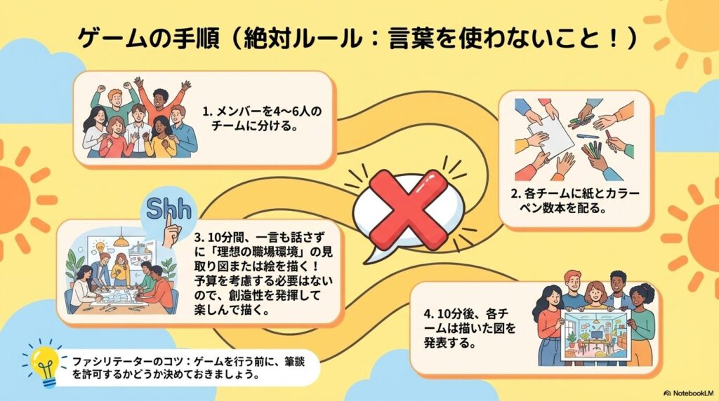 - 無言での実行(10分間): 一切しゃべらずに、チームで協力して1枚の図を完成させます。