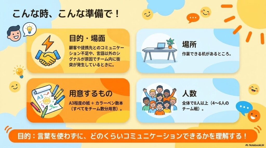 - チーム分けと配布: メンバーを4〜6人のチームに分け、紙とペンを配ります。