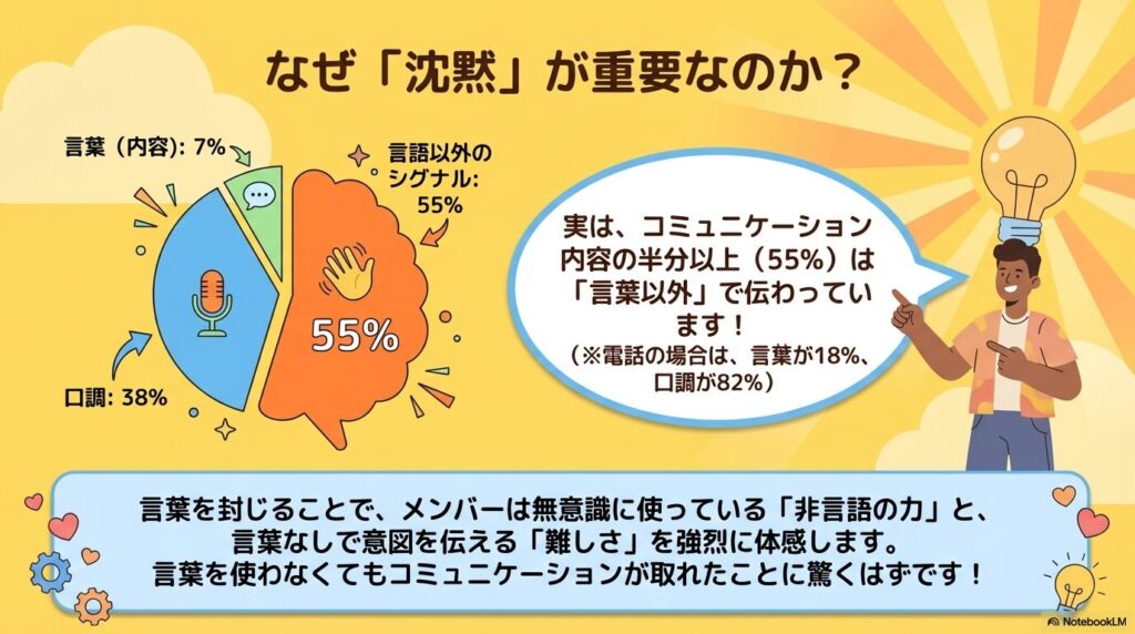 私たちは普段、言葉に頼りすぎて相手の本質的な意図を見落としがちです。あえて言葉を封印することで、「言葉を使わずにどこまで意思疎通ができるか」を深く理解することを目的としています。