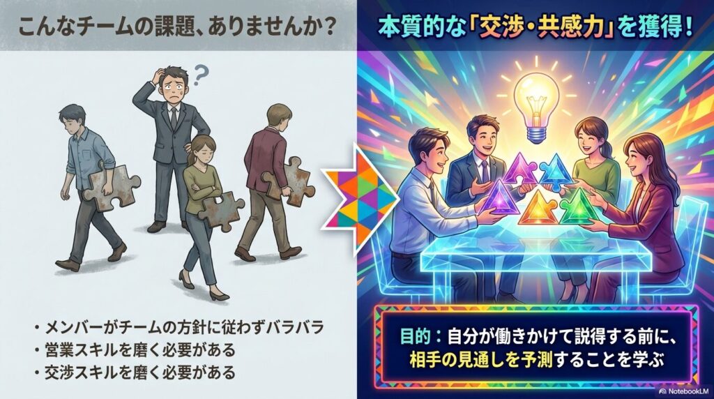 このゲームは、単なるカード集めではありません。相手が何を欲しがっているのか、自分たちは何を差し出せるのかという、ビジネスにおける交渉の本質を体験できるワークショップです。