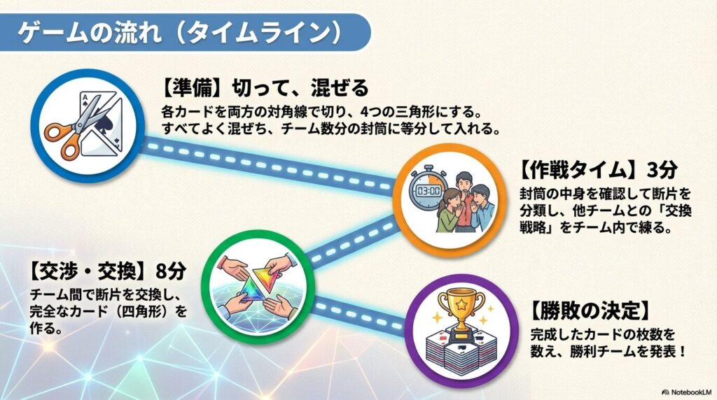 このゲームでは、バラバラになったカードの断片をチーム間で交換し、いかに多くの「完全なカード」を完成させるかを競います。