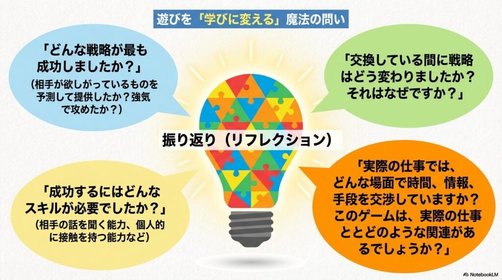 感想会での鋭い問いかけ: 前述の「成功させる7つのステップ」でもお伝えした通り、このゲームの価値は「感想会」にあります。以下のような質問で学びを深めましょう。
