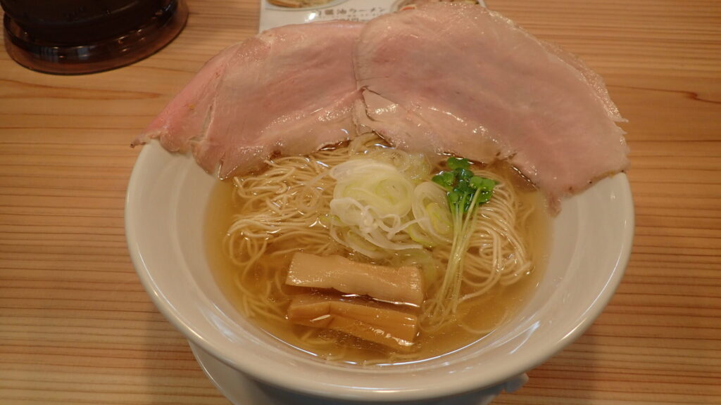 鶏ガラベースに鰹節の風味を合わせた出汁に、白醤油を加えたラーメン。軽やかでクリアな味わいのスープが特長。麺はスープに絡むストレート麺を使用。トッピングには、薄くスライスした熟成のレアチャーシュー2枚に、ネギ、メンマ、アクセントとしてのかいわれ大根。