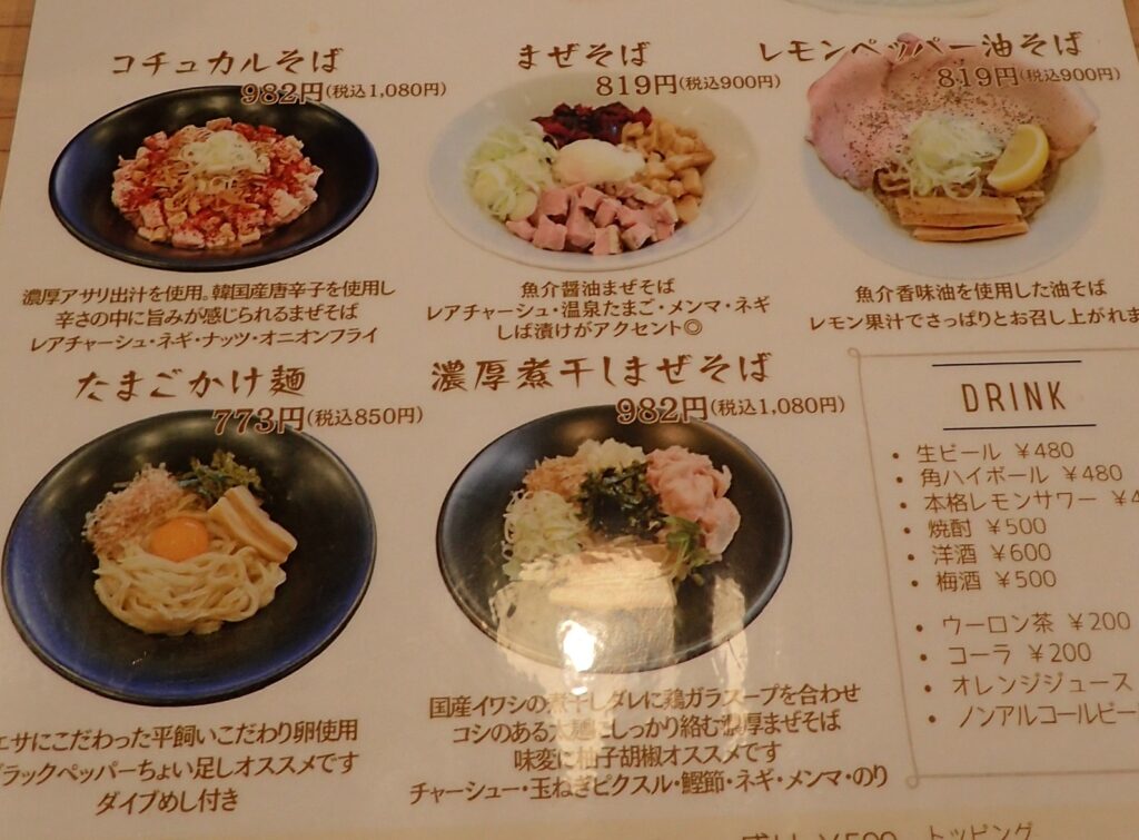 2種類の醤油ラーメン以外にも、「コチュカルそば」「レモンペッパー油そば」「たまごかけ麺」などメニューは豊富。しかし胃袋の都合もあり、今回は頂くことが出来なかった。次回訪問時の楽しみにとっておくことにしよう。