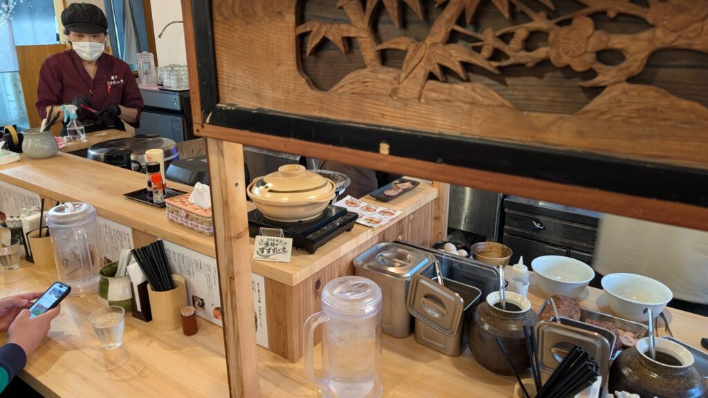 カウンター上部には屋台を思わせる屋根が設置され、七輪でチャーシューを炙るライブ感ある演出も特徴だ。木の温もりを感じる和風の空間で、ラーメン店ながらどこか割烹のような落ち着きがある。